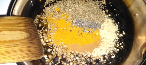 1-Dry roast the spices in a small pan over medium low heat. Grind any of them that are whole and mix them together.